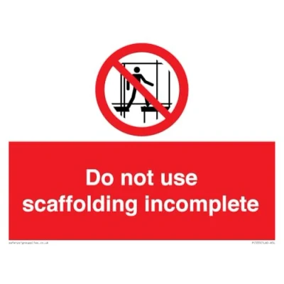 P025 : Do not use this incomplete scaffold This sign is made from vinyl / sticker Air Release vinyl makes it easy to stick to flat, clean surfaces without bubbles. Not for rough, plastic or dusty surfaces. A5 landscape Sign Text: Do not use scaffolding incomplete