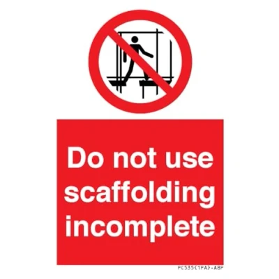 P025 : Do not use this incomplete scaffold This sign is made from vinyl / sticker Air Release vinyl makes it easy to stick to flat, clean surfaces without bubbles. Not for rough, plastic or dusty surfaces. A8 portrait Sign Text: Do not use scaffolding incomplete