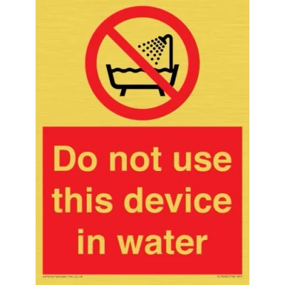 P026 : Do not use this device in a bathtub, shower, or water-filled reservoir This sign is made from vinyl gold sticker Gold metal effect sticker for flat, clean surfaces. Not for rough, plastic, or dusty surfaces. A5 portrait Sign Text: Do not use this device in water