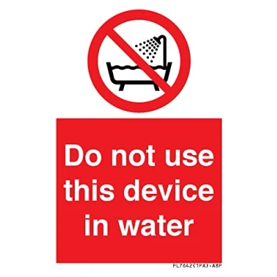 P026 : Do not use this device in a bathtub, shower, or water-filled reservoir This sign is made from vinyl / sticker Air Release vinyl makes it easy to stick to flat, clean surfaces without bubbles. Not for rough, plastic or dusty surfaces. A8 portrait Sign Text: Do not use this device in water