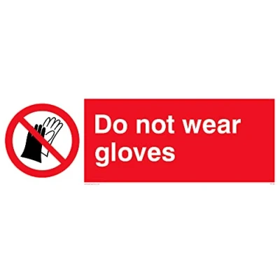 P028 : Do not wear gloves This sign is made from vinyl high tack A stickier sticker. Uses a stronger adhesive to make it more suitable for plastic surfaces like Wheelie Bins or where the sticker might get rubbed. 31 landscape Sign Text: Do Not Wear Gloves