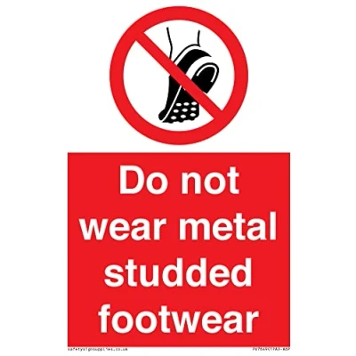 P035 : Do not wear metal-studded footwear This sign is made from vinyl / sticker Air Release vinyl makes it easy to stick to flat, clean surfaces without bubbles. Not for rough, plastic or dusty surfaces. A6 portrait Sign Text: Do not wear metal studded footwear