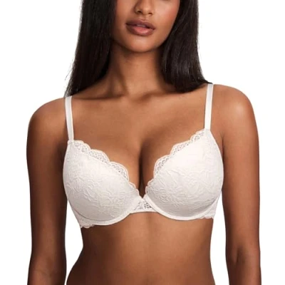 DOBREVA Women's Push Up Lace Bra Sexy Plunge Padded Underwire Support Bras Lift Coconut White 38D