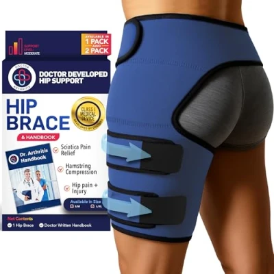 DEVELOPED BY DOCTORS: Our sciatica hip support provides comfort, helping stabilize your hip joint and strengthen muscles. Whether you're on the move or in recovery, this hip wrap is the ideal solution for dependable comfort & reinforcement. TARGETED COMPRESSION: With adjustable straps & a non-slip design, our hamstring support brace offers secure, all-day support. From managing daily activities to pushing through workouts, our thigh compression sleeve allows you to move comfortably. EMPOWER YOUR MOVEMENT: Constructed from a blend of neoprene & nylon, our hip and back stabilizer fits seamlessly under clothing. This sciatica belt is designed to address various pelvic issues, promoting a smooth recovery experience. DOCTOR WRITTEN HANDBOOK: Our sciatic nerve brace comes with a medical handbook, providing insights & targeted physiotherapy exercises for hip bursitis, pulled groin & more while achieving your sports & leisure aspirations. DR. ARTHRITIS PROMISE: With our dedicated team ready to assist you, we'll address all inquiries promptly. We're committed to providing exceptional customer service to ensure your satisfaction with our advanced hip support for men and women.
