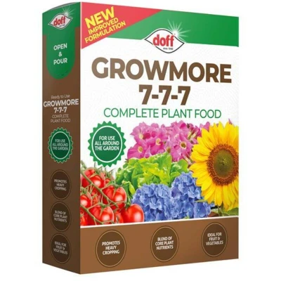 General description Doff Growmore Ready To Use Fertiliser is a traditional general-purpose plant food, perfectly balanced for use all around the garden, supplying the three major plant nutrients in equal measure. It can be applied as a top or base dressing to a wide variety of crops and ornamentals, boosting fruit and vegetable crops by building soil fertility. Technical specifications NPK ratio: 7:7:7 Weight: 2 kg
