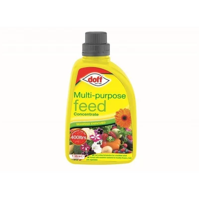 General description DOFF Multi-Purpose Feed Concentrate is enriched with seaweed extract, promoting strong and healthy growth for container and basket grown plants, as well as all other garden plants. This fast-acting formula enhances flowering, fruiting, greener growth, healthier plants, and root development. Technical specifications Volume: 1 litre Dilution: One litre makes up to 300 litres of plant feed Form: Easy to dilute liquid