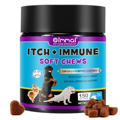 100% NATURAL DELICIOUS DUCK FLAVOR CHEWABLE TABLETS:Dog Itch immune soft treats are made with real duck meat, brewer's yeast, and herbal extracts, free from artificial additives, fillers, or irritating chemicals. A delicious, easy-to-feed anti-itch snack,Gentle yet effective, suitable for dogs with sensitive skin and stomachs HEALTHIER DOG SKIN AND COAT: Dog Itch immune softchews are rich in vitamins, minerals and nutrients to strengthen the dog's immune system against seasonal, food and environmental allergies, relieve excessive itching, redness, sneezing, skin irritation, scratching, chewing paws or other allergies symptom BOOST IMMUNE SYSTE & DIGESTIVE HEALTH: Itch & Immunity Treats for Dogs contain digestive enzymes, probiotics, and essential vitamins to enhance your dog's natural defenses and support long-term immunity. They help reduce allergic reactions while improving digestion and nutrient absorption IDEAL FOR ALL DOG BREEDS & SIZES: Dog allergy relief treats for dogs are safe and effective suitable for all breeds, sizes and ages, puppies, adult dogs, and seniors.Natural ingredients, with no additional fillers TASTY & EASY TO FEED: Delicious peking duck-flavoured chews dogs enjoy. Feed daily according to your dog’s size: up to 25 lbs – 1 chew, 25–50 lbs – 2 chews, 51–70 lbs – 3 chews, 71–90 lbs – 4 chews, over 90 lbs – 5 chews
