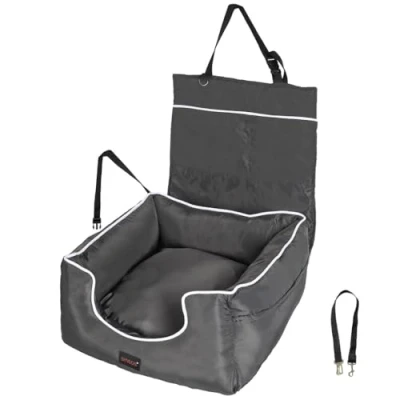 ManoManoGeneral description Your dog car booster seat is designed to keep your pet safe and secure while traveling. It doubles as a comfortable dog bed, allowing your furry friend to relax and enjoy the ride. With features tailored for active dogs, this seat is built to withstand scratches and bites, ensuring durability for both dogs and cats. The seat includes a detachable and washable cover for easy maintenance. Technical specifications Brand: Skylos Surface material: 420D Oxford cloth + Polyester Filling material: Polypropylene cotton Bed dimensions: 55cm x 55cm x 22cm (W x D x H) Cushion dimensions: 44cm x 44cm x 15cm (W x D x H) Backrest dimensions: 55cm x 44cm (L x W) Safety belt length: 59cm Backrest fixed belt length: 79cm Bed fixed belt length: 111cm Color: Grey Usage Clip your dog into the car seat for safe travel. Unclip your dog at your destination to allow them to explore. Ensure your pet is leashed in the back for added safety. Other information Key features: Double-sided