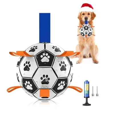 YOUR DOGS NEW FAVOURITE TOY: Fetch, tug, flip it in the air for hours of interactive fun for your furry friend. You and your kids can also play games with your pet. The handle allows you to throw the ball and your dog to retrieve it easily.MADE FOR YOUR DOG: We bring you the best toys designed especially for your dog, one with secure nylon tabs sewn into its seams. Dog ball is made of premium PU like a standard soccer ball and conforms to the same safety standards as children's toys. Environmentally friendly, eco-friendly, safe, and nontoxic.IDEAL FOR WATER PLAY: Don’t worry about this football getting wet, the ball is very easy to clean with a wet cloth. In fact, it’s as much at home in the water as on land. It's specially designed to float in the water so bring it to the pool, lake, or beach!PERFECT GIFT: The ball is 6 inches in size and is suitable for small to medium dogs. Combined with a high-quality air pump, it makes an excellent gift.WE CARE: We are a UK company with UK-based customer service. If you are not 100% satisfied, please contact our friendly support team. ORDER NOW! Unit count: 1.0