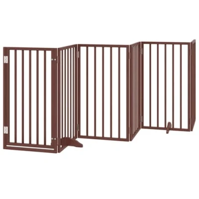 General description The Dog Gate with Door is designed to create a secure area for your pets, ensuring their safety while preventing disturbances. This foldable gate is made from durable poplar wood and features a practical design with a door panel for easy access. Technical specifications Material: Poplar wood Colour: Brown Dimensions of each panel: 50 x 90 x 2 cm (W x H x T) Total length: 300 cm Bar spacing: 6 cm Feet dimensions: 30 x 8 x 2 cm (L x W x H) Suitable for small/medium dogs Assembly required: Yes Compatibility and accessories Delivery contains: 5 x Panel 1 x Door panel 2 x Feet 14 x Hinge 2 x Door lock 1 x Wrench Installation The dog gate is freestanding and foldable, requiring no installation or drilling, making it easy to set up and relocate as needed. Usage This dog gate is perfect for keeping your pets safe in various areas of your home, including the living room, kitchen, stairs, and doorways. It effectively prevents pets from jumping over or passing through. Other