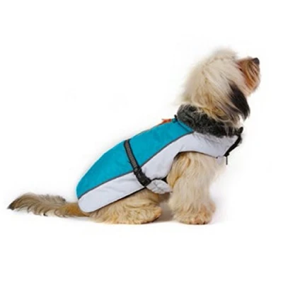 This sporty jacket is sure to keep dogs warm and dry in the winter months --it even features a faux fur collar! The Aspen Parka sports a wind and waterproof outer shell with a soft fleece lining with Repelz-It Features include reflective trim, poly-fill insulation, elastic waist and dual buckle fasteners. Available in a variety of newly updated vibrant colors.
