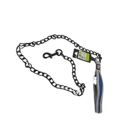 Black metal strap highly resistant to pulling and biting. Blue padded cuff for a comfortable and secure grip. Ideal length to maintain control of the dog without restricting its movement. Durable and stylish design, suitable for daily use. Perfect for dogs of all breeds and sizes. Reinforced carabiner for a firm and reliable hold.