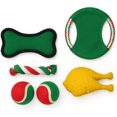 Dog Pack of 5 Interactive Christmas Pet Chew Toy Squeak Honking Toys Santa Ginger Ball & Rope Xmas Puppies Doggy Gift (Pack 6 Green)