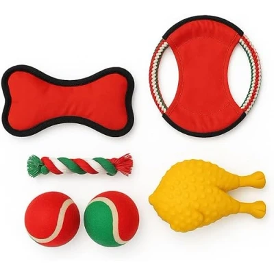Dog Pack of 5 Interactive Christmas Pet Chew Toy Squeak Honking Toys Santa Ginger Ball & Rope Xmas Puppies Doggy Gift (Pack 6 Red)