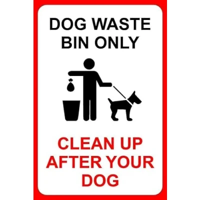 Dog waste bin only clean up after your dog safety sign. 1mm flexible Plastic sign. Digitally printed for extra durability. Drill and screw in position or use double sided tape to mount onto suitable surface. All signs come with a 5-year warranty. All our signs are UV resistant meaning they will not fade in sunlight. Suitable for indoor & outdoor use.