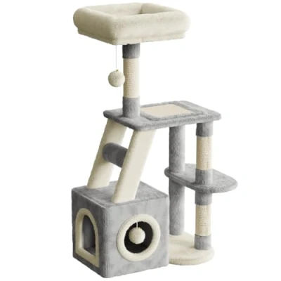 Dogat Cat Tree, Tree Tower, Scratching Post Multi Level, Activity Centre Play House Furniture for Small/Medium Cats, Condo Climbing Grey+Beige