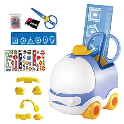 Children's desk set. Includes: plastic scissors, 3-in-1 ruler, eraser, bag with coloured clips, 3 sheets of stickers to customise and 6 erasers in different shapes.