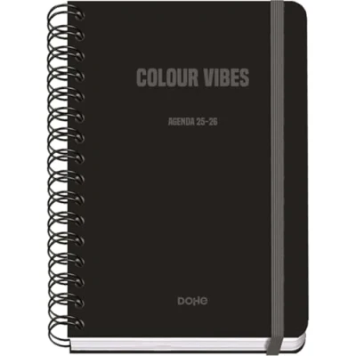 Dohe School Planner 2025 2026 Week to View, A5 Size (15x21 cm), Spanish and English, Double Spiral Binding Elastic Band, Hard Cover, 4 Sticker Sheets COLOUR VIBES Black