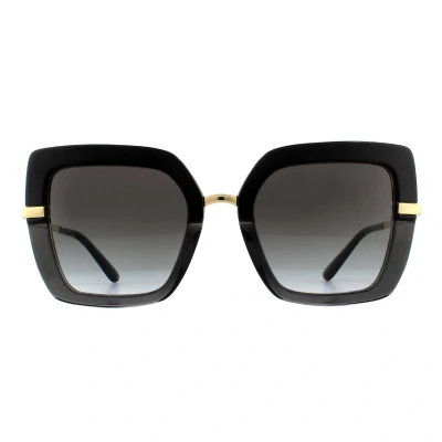 Secret SalesDolce & Gabbana Sunglasses DG4373 32468G Top Black on Transparent Grey Gradient are a striking square style frame with the iconic Print Family Theme. DG4373 have a half print design with each half separated by metal detailing that follows around to the temples with Dolce & Gabbana engravings.