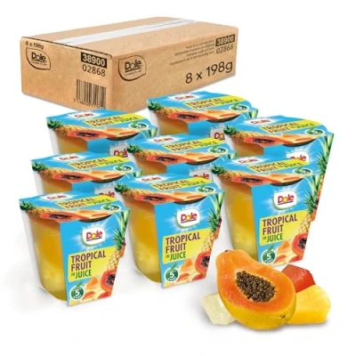 🥪 LUNCHBOX SNACKS: Enjoy the refreshing taste of high-quality fruit in a convenient individual pot (with toothpicks included) wherever you are, at home, school, at the office or as a snack in your packed lunch. ✨ BULK PACK: The same great-tasting pots, now in a bigger bulk 8 pack! Perfect for larger families or households wanting a multi-buy discount. We recommend storing them ambient in a cool, dry area and protect from freezing. ✔️ 100% NATURAL FRUIT: Dole fruit cups are a quick, delicious & healthy fruit snack or dessert for adults & kids, combining the highest quality fruit in 100% real fruit juice. 🍍 1 OF YOUR 5 A DAY: Dole fruit pots are a rich source of vitamin C & fibre & contain no added sugar, artificial preservatives, sweeteners or flavours. Vegetarian & vegan friendly, these are the perfect healthy snack for all - just peel the lid, & enjoy. 🌱 THIS FRUIT'S STORY: Dole's fruit pots contain pineapple grown in rich volcanic soil and papaya nurtured in the brilliant Philippines sun.
