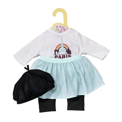 DOLLY MODA PARIS LOOK - Fits dolls 39–46 cm. “Bonjour!” from Paris. The turquoise tulle skirt, matching beret, black leggings, and shirt with the city skyline FOR SMALL HANDS - Made in an easy fit style so even the smallest children can effortlessly put it on and take it off INCLUDES - Dolly Moda Paris outfit with shirt, leggings, skirt, and a hat ENCOURAGES IMAGINATION - Role play with Dolly Moda boosts the imagination and has been proven to support the development of social skills, and values such as responsibility, communication, and empathy AGES 3 PLUS - Fits all BABY born and Baby Annabell branded dolls and other dolls in sizes 39 – 46cm (available separately), Manufacturer: Dolly Moda