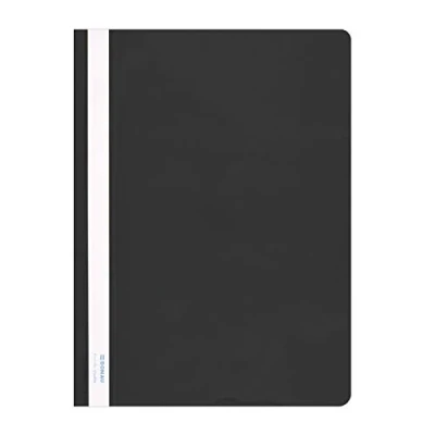 File folders made of durable PVC, hard - pack of 10 Transparent front, hard crystal clear cover sheet - PP thickness: 150 µm Coloured back - Thickness: 160 µm Holds approx. 200 sheets (2 cm) for A4 Not for stapling, metal hook-in folder. Interchangeable, double-sided edging tape. Plastic file folder model 1705001PL-01 Donau, dimensions: 230 x 310 mm, A4, colour: black. Perfect for office and school