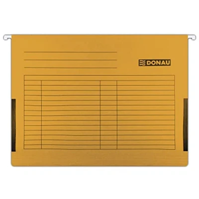 DONAU 7420905-12 Suspension File with Linen Frogs Interchangeable Blank Labels - Pack of 5 Made from cardboard with a weight of 230 GSM, ideal for office and school and the government Metal hanging handle for longer product life Equipped with side linen edges that prevent documents from falling out With movable index bookmarks and description boxes (with interchangeable blank labels). Capacity: 400 sheets in A4 format. Made from recycled cardboard. Material quality: 230 g. For paper format DIN A4. Format: A4, colour: orange. With the green dot - participation in the recycling and recycling system, which results from the provisions of Polish and EU law