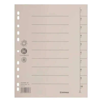DONAU 8610001-25 dividers A4 made from 250 g/m² recycled cardboard, 4-hole punching, format 235 x 300 mm, for DIN A4, pack of 100, colour: light brown - for storing document sleeves With line printing for easy labelling, 4 hole punching Dividers with organisational print perforated edge glued back Blue Angel certified With the green dot – participation in the recycling and recycling system resulting from the provisions of Polish and EU law. For DIN A4 formats with line print 1-10 printed on one side