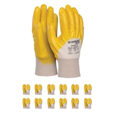 DONAU SAFETY 32051521-10 Cotton Knit Work Gloves / Nitrile Nitrile Gloves / Protective Nitrile Coating / Size 10, 12 Pairs Colour: yellow and white. Category: II. Conforms to EN 388:2016+A1:2018 (4111X), EN ISO 21420:2020. Materials: cotton/nitrile Cotton knit gloves, ¾ with yellow nitrile coating, suitable for mechanical, service, transportation, construction, industrial and agricultural work. High abrasion resistance yellow nitrile coating. Suitable for wet and oiled environments (water and oil resistant). Finished with soft cuffs. Protective gloves to protect against mechanical damage.