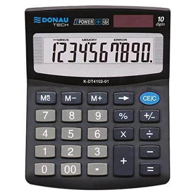 DONAU Tech desktop calculator, with 10-digit display with solar and battery operation, compact design, high-quality workmanship Calculator: Large LCD display - The large buttons and convenient for note Size: 125 x 100 x 27 mm, colour: black Delete last entry and calculate percentages Automatic shutdown 5 year warranty Packaging/box with hole for hanging This applies to profit margins, for example. These calculators feature large buttons and a single-line display. These devices are inexpensive and make office work much easier With the Donau Tech brand, you will receive premium products that combine tradition with modern design as well as value for money with high quality and a 5-year warranty