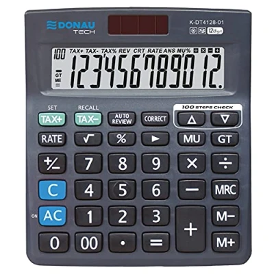 DONAU TECH/K DT4128 01 Desktop Calculator 12 Digit Root Function 140 x 122 22 mm Colour: Black/Calculator with Display/Dual Power Solar/Battery Operated/Compact Design