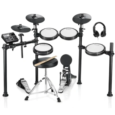 【Experience the Difference of Mesh Heads】The full mesh electronic drum set provides drummers with the most realistic and responsive feel, thanks to its unique and durable mesh heads that do not deform or sag over time, giving a closer feel to acoustic drums. 【High-Quality 8-Piece Drum Set】The DED-200 electric drum set includes 1 x 8" dual-zone mesh snare, 3 x 8" mesh tom-tom, 1 x 6" kick drum with double-pedal compatibility, 1 x 10" hi-hat, 1 x 10" crash, and 1 x 10" ride with w/choke, all with stable and evenly distributed tone responses due to the premium silicone pads in sleek black. 【Rich Sounds Selection】With faithful real drum sampling, the electric drum kit offers 450 sounds and 31 classic and modern drum kits that are more than enough to deliver an exciting performance. 【Powerful Features】The built-in 50 play-along songs, sequencer, metronome, auxiliary input, and recording function are all helpful tools for drummers to practice and develop their skills, while the kit's MP3 player and smartphone compatibility make it perfect for practicing at home or performing with a band! 【Complete Accessories】Everything you need is included: a foldable iron metal stand with a stable and secure 4-post aluminum rack, hi-hat control, bass drum pedal, headphones, drum throne, audio cable, and drumsticks. 【Interactive Drum Lessons】Free virtual lessons from Melodics are available to help you improve your skills and master any genre or technique you want.