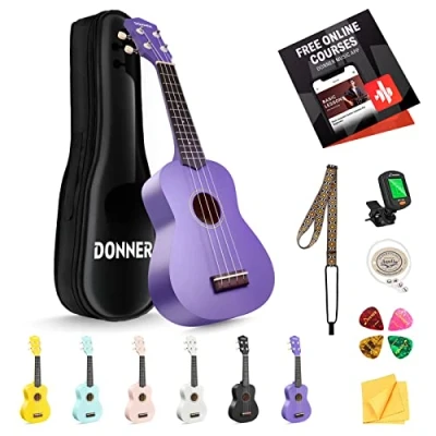 Smooth Matte Macaron Finish:Premium basswood body with smooth matte finish creates bright and warm sound. Smooth matte macaron color finish give you great skin-friendly feel and attractive looking ukelele. Keep Stay In Tune: Set with Aquila strings and chrome guitar style tuners, keep your ukulele always in tune, and provide precise intonation and better sustain. Smooth polished frets let you play comfortably without cutting fingers All in One Ukulele Starter Kit: Donner soprano ukulele kit includes everything beginners need, including soprano ukulele, carrying bag, digital clip-on tuner, strap, extra pack of Aquila ukulele strings, 4 picks and cleaning cloth Easy to Learn with Free Online Video Lessons: Looking for an easy to learn instrument for you or? Whether, teens, students or adults, any ukulele newbie can get started quickly with the Donner 21 inch ukulele and free professional online video uku lessons. A Decent Gift for Music Lovers :A great learning instrument for music lessons, self-study. Good as a festival gift for a music lover. Perfect for birthday, Christmas, Thanksgiving, school opening, etc