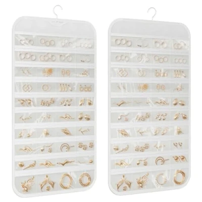 You will receive ONE hanging jewelry organizer, double-sided with a total 80 pockets Appropriate Size: Hanging Jewelry Organizer measures 17.3" W x 33.5" H; the small compartment measures 4.3" W x 2.3" H; the big compartment in the bottom row measures 4.3" W x 4.3" H Double-sided Jewelry Storage Bag: The Bag contains 80 clear plastic pockets. Made of non-woven fabric and clear PVC, easy-to-find earrings and other small accessories, are also safe to protect your collection Lightweight and Foldable: Soft can be put into your luggage to accompany you on trips, travel, and other activities to avoid the jewelry organizer occupying more space Rotatable 360 Degrees: The top hook can be rotated 360 degrees to meet the needs of different hanging situations, such as hanging on the door or in the closet, and help you find your jewelry faster and more efficiently More than a Jewelry Organizer: Organize and classify rings, earrings, necklaces, hair accessories, bracelets and more in a better way, it can even be used for small items storage and collectibles exhibition. Give full play to your creativity