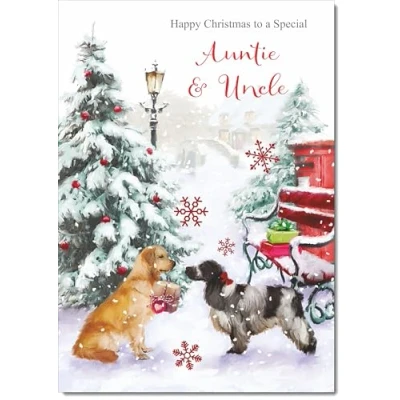 DOODLECARDS ⭐ Auntie and Uncle Christmas Card Two Dogs in Snow Medium Size Christmas Card for Auntie & Uncle with Plain Envelope MESSAGE INSIDE ⭐ Please see the second image for any words inside the card. QUALITY ⭐ Printed in the UK on Luxury Italian 350gsm Board with a Contempory Matt finish. SIZE ⭐ Medium Size Card 22 x 15cm. Posts with standard Letter post. ECO FRIENDLY ⭐ 100% Recyclable, FSC certified paper. RECIPIENTS ⭐ Matching Cards available for other recipients - same size and quality. DOODLECARDS ⭐ Include 'doodlecards' in your search for the perfect Greeting Card.