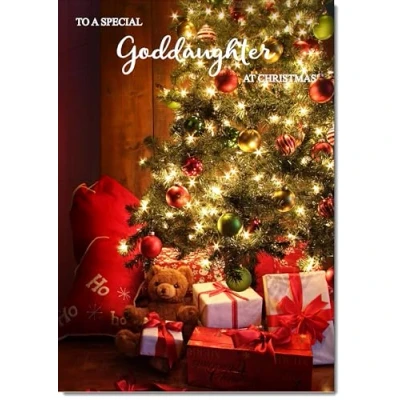 DOODLECARDS ⭐ Goddaughter Christmas Card Teddy by Christmas Tree Medium Size Christmas Card for Goddaughter with Plain Envelope MESSAGE INSIDE ⭐ Please see the second image for any words inside the card. QUALITY ⭐ Printed in the UK on Luxury Italian 350gsm Board with a Contempory Matt finish. SIZE ⭐ Medium Size Card 22 x 15cm. Posts with standard Letter post. ECO FRIENDLY ⭐ 100% Recyclable, FSC certified paper. RECIPIENTS ⭐ Matching Cards available for other recipients - same size and quality. DOODLECARDS ⭐ Include 'doodlecards' in your search for the perfect Greeting Card.