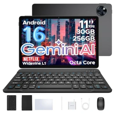 【Newest Android 16 + Gemini AI, Octa-core Processors】: DOOGEE U11 PRO 11 inch Tablet enhances your productivity through the dynamic combination of Android 16 and Gemini AI, offering real-time translation, intelligent text suggestions, and AI-enhanced multitasking. Powered by the T7200 octa-core processor, it delivers fast and energy-efficient performance, enhancing multitasking capabilities. Additionally, it introduces stronger security measures to protect against Intent redirection attacks, ensuring your data is safer than ever. 【All-In-One Accessory】: DOOGEE U11 Pro 11 inch tablet includes a mouse, Bluetooth keyboard, Protective film, protective case, charger, Touching Pen and more. With its lightweight and portable design, it can easily fit inyour backpack or handbag. And Built-in WPS Office, allowing users to easily edit documents and review files efficiently. Supports PC mode and stylus. Protective case is provided to protect the screen and back cover from scratches and can also be used as a stand. 【30(6+24)GB RAM+256 GB ROM+2 TB Expansion】: DOOGEE U11 Pro android 16 tablet comes with a powerful combination of 30GB RAM (6GB+24G8) and 256GB ROM storage. Micro SD/ TF memory expansion (20GB-2TB) is supported, and this memory can be set as extra storage or portable storage for the tablet. The tablet operates seamlessly, whether you are using multiple apps at the same time or running games, and the newly introduced Mlemory Manager offers suggestions for clearing space to free up room on the tablet. 【11 inch Tablet+ 90Hz Display + Widevine L1 + 1080P】: The DOOGEE U11 Pro features an 11-inch HD lPS screen with a 90Hz Full HD display, offering a cinema-grade viewing experience. Widevine Li certification lets you stream YouTube, HB0, and Prime Video in true 1080P resolution. Whether binge-watching or enjoying your favorite shows, the 90Hz refresh rate ensures smooth, responsive performance, elevating your entertainment and enhancing everyday life. 【8580mAh Battery & 7.9mm Metal Body】: This android 16 Tablets 11 inch with 8580mAh large battery can easily work or play for a whole day, offers up to 11 hours of video playback, 26 hours of music enjoyment, and 8 hours of gaming. Support OTG reverse charging. The doogee U11 Pro boasts a sleek metallic back cover, weighing only 540g and measuring 7.9mm thick. With a back cover metal design, curved edges and a gentle matting process, U11 gaming tablet offers a soft feel and premium look. 【Connectivity + Ports】: DOOGEE U11 Pro android tablets support WiFi 5G and Wifi 2.4G for great compatibility and high speed downloads for home, campus networks and hotspot networks. Built-in Bluetooth 5.0 and AGPS Bluetooth 5.0 can transmit at speeds up to 4-24Mbps, and AGPS allows for precise positioning and navigationover a network connection. The U11 Pro tablet 11 inch has 1 Type-C port, 1 3.5mm AUX headphone jack and 1 SDcard port. 【Face Unlock & 13MP+5MP Camera】: Unlock instantly with Face Unlock, blending speed and security for seamless access to this android tablet. The 13MP rear camera captures crisp, detailed shots perfect for scanningdocumenls, snapping landscapes, or casual photography. A 5MP front camera enhances video calls and selfeswith Al-powered optimization, even in low light. Whether you're mulitasking or connecting remotely, this DOOGEE tablet 11-inch android 16 balances convenience and clarily. 【App Cloning and Game Space】The DOOGEE U11 PRO AI gaming tablet with keyboard offers app cloning, enabling dual accounts for social apps, office applications, and games. Each account’s data is securely isolated, safeguarding privacy while boosting efficiency. Game Space enhances gaming with professional optimisation, maintaining high frame rates for smooth performance.