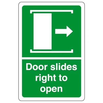 Doors slides right to open - safety sign, health & safety signage, workplace safety, - Indoor/outdoors Safety Sign to meet legal obligations and foster compliance. High-tack self-adhesive vinyl offers the optimal solution for indoor signage. Its easy application—simply peel off the backing and fix to your chosen location—makes it ideal for non-porous, flat, uneven, or curved surfaces. Measuring 200mm x 150mm, our sign ensures optimal visibility when mounted at eye level for viewing within 5 meters, effectively enhancing safety and communication on the road network This sign conforms to EN ISO 7010:2012 standards, featuring a centrally positioned black pictogram or text against a contrasting background, ensuring clear communication and adherence to safety regulations Experience peace of mind with our comprehensive 4-year warranty indoor signage. We stand by our commitment to quality, ensuring durability and reliability for every product