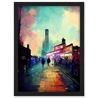 Doppelganger33 LTD Brick Lane London 1960's Night Street Scene Oil Painting Artwork Framed A3 Wall Art Print