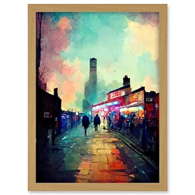 Doppelganger33 LTD Brick Lane London 1960's Night Street Scene Oil Painting Artwork Framed A3 Wall Art Print