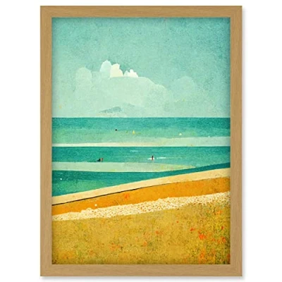 Doppelganger33 LTD Calm Sandy Beach Summer Scene In Ochre And Teal Minimalist Artwork Framed Wall Art Print A4