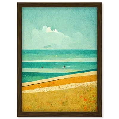 Doppelganger33 LTD Calm Sandy Beach Summer Scene In Ochre And Teal Minimalist Artwork Framed Wall Art Print A4