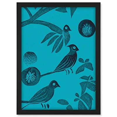 Doppelganger33 LTD Linocut Vintage Blue Birds Jungle Pattern Illustration Teal Artwork Framed A3 Wall Art Print