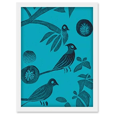 Doppelganger33 LTD Linocut Vintage Blue Birds Jungle Pattern Illustration Teal Artwork Framed Wall Art Print A4