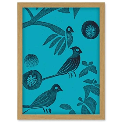 Doppelganger33 LTD Linocut Vintage Blue Birds Jungle Pattern Illustration Teal Artwork Framed Wall Art Print A4