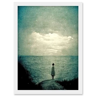 Doppelganger33 LTD Looking Out To Sea Dreamscape Lone Woman Dusk Calm Elegant Panting Artwork Framed A3 Wall Art Print