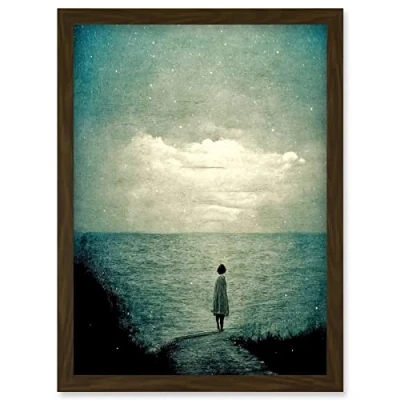 Doppelganger33 LTD Looking Out To Sea Dreamscape Lone Woman Dusk Calm Elegant Panting Artwork Framed Wall Art Print A4