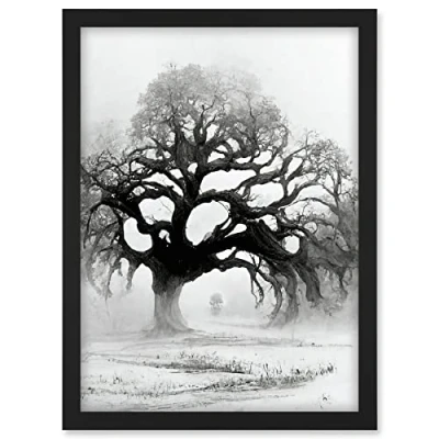 Doppelganger33 LTD Old Oak Tree In Misty Landscape Pen Ink Illustration Artwork Framed A3 Wall Art Print