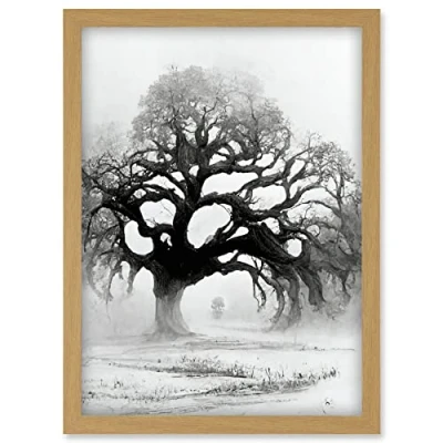 Doppelganger33 LTD Old Oak Tree In Misty Landscape Pen Ink Illustration Artwork Framed Wall Art Print A4
