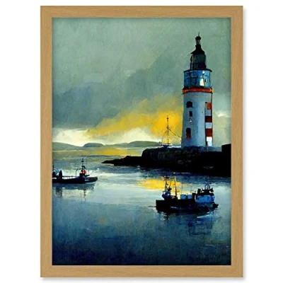 Doppelganger33 LTD Scottish Harbour Fishing Boats Lighthouse Modern Artwork Framed A3 Wall Art Print